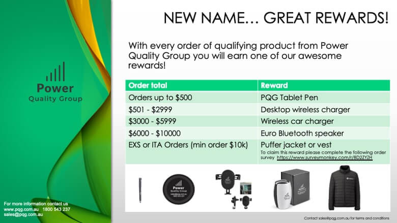 With every order of qualifying product from Power Quality Group you will earn one of our awesome rewards!