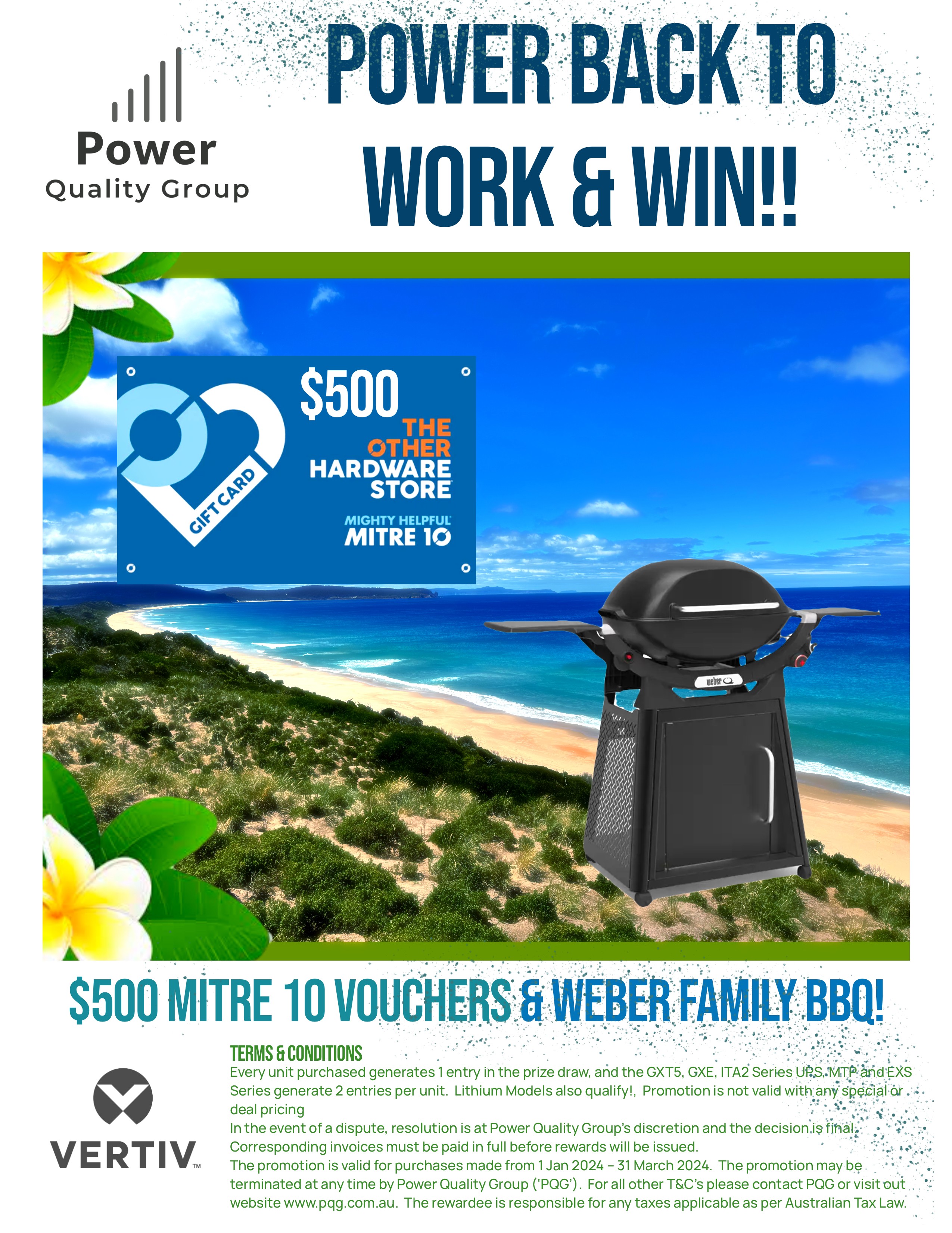 Every unit purchased generates 1 entry in the prize draw, and the GXT5, GXE, ITA2 Series UPS, MTP and EXS Series generate 2 entries per unit. Lithium Models also qualify!, Promotion is not valid with any special or deal pricing. In the event of a dispute, resolution is at Power Quality Group’s discretion and the decision is final. Corresponding invoices must be paid in full before rewards will be issued. The promotion is valid for purchases made from 1 Jan 2024 – 31 March 2024. The promotion may be terminated at any time by Power Quality Group (‘PQG’). The rewardee is responsible for any taxes applicable as per Australian Tax Law.